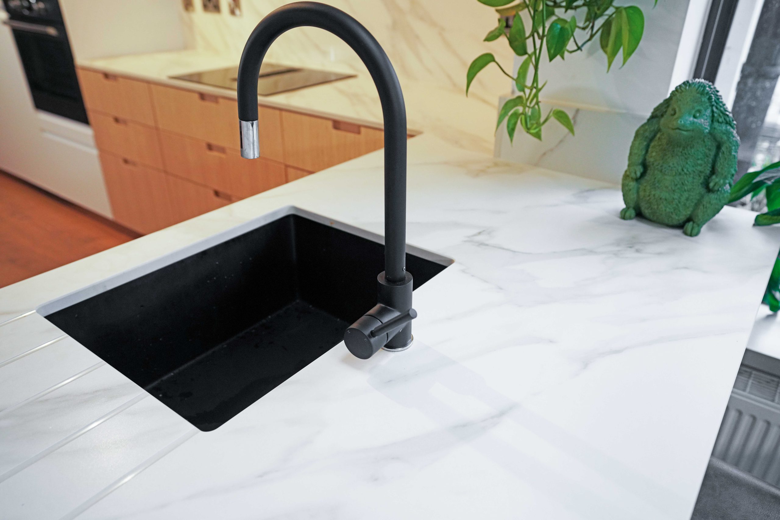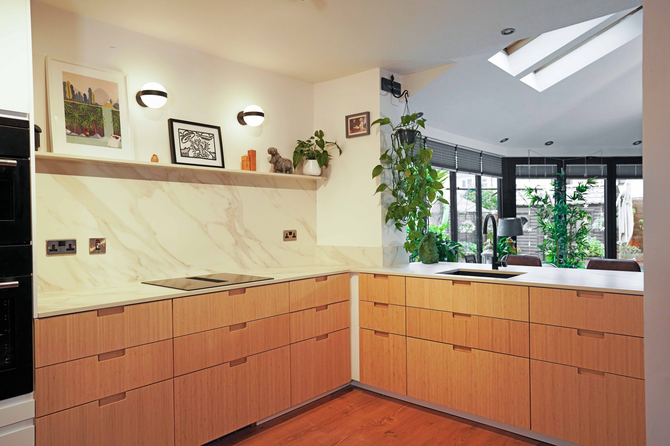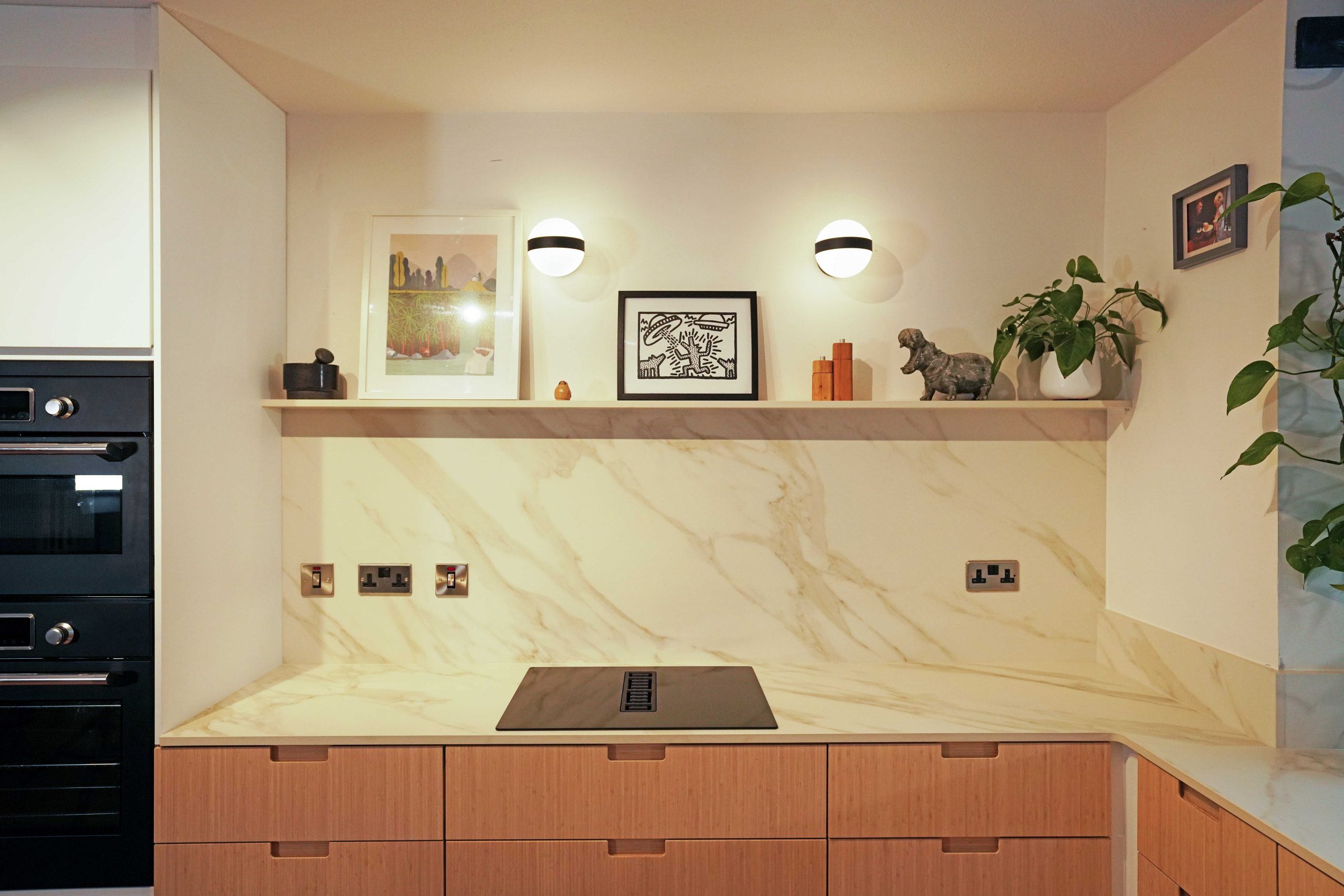 Stone Ideas is excited to showcase this breathtaking kitchen worktop, crafted from our exquisite Ducal Gold Porcelain. In crafting this kitchen, we employed a sophisticated technique known as vein matching. This method precisely aligns the veins of adjoining stone slabs, ensuring a flawless, continuous appearance throughout the countertop, wall cladding, and floating shelf. Vein matching not only enhances the visual appeal of the stone surfaces but also creates a harmonious and stunning design that truly showcases the stone’s natural beauty.